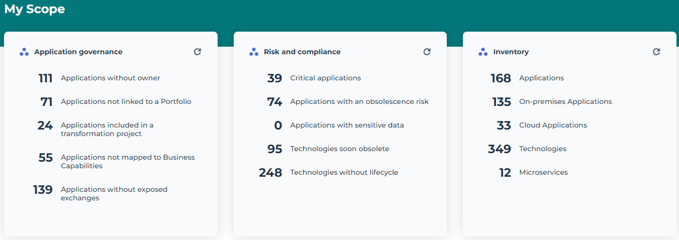 The My Scope section provides useful indicators on application assets. Clicking the indicator takes you to all the corresponding objects. There are three groups of indicators:
