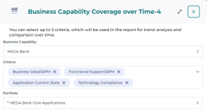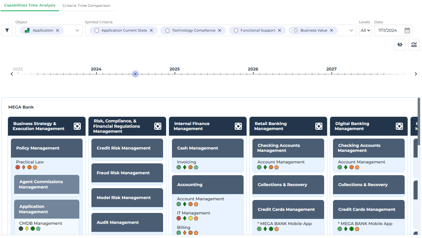 This report provides a temporal representation of the elements that make up a business capability map and the applications or application systems that cover them.