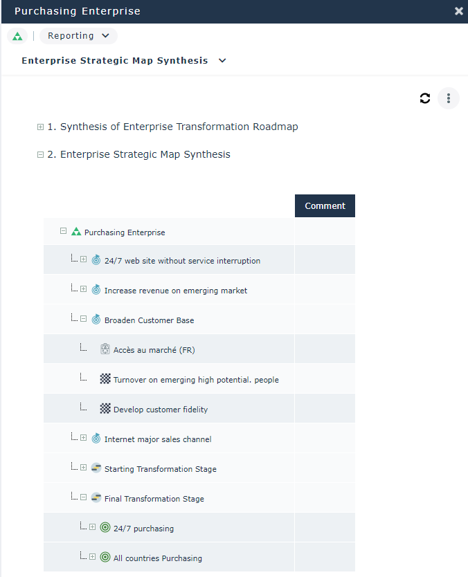 A number of functionalities are available to display and analyze an enterprise's transformation strategy and the stages of its deployment.