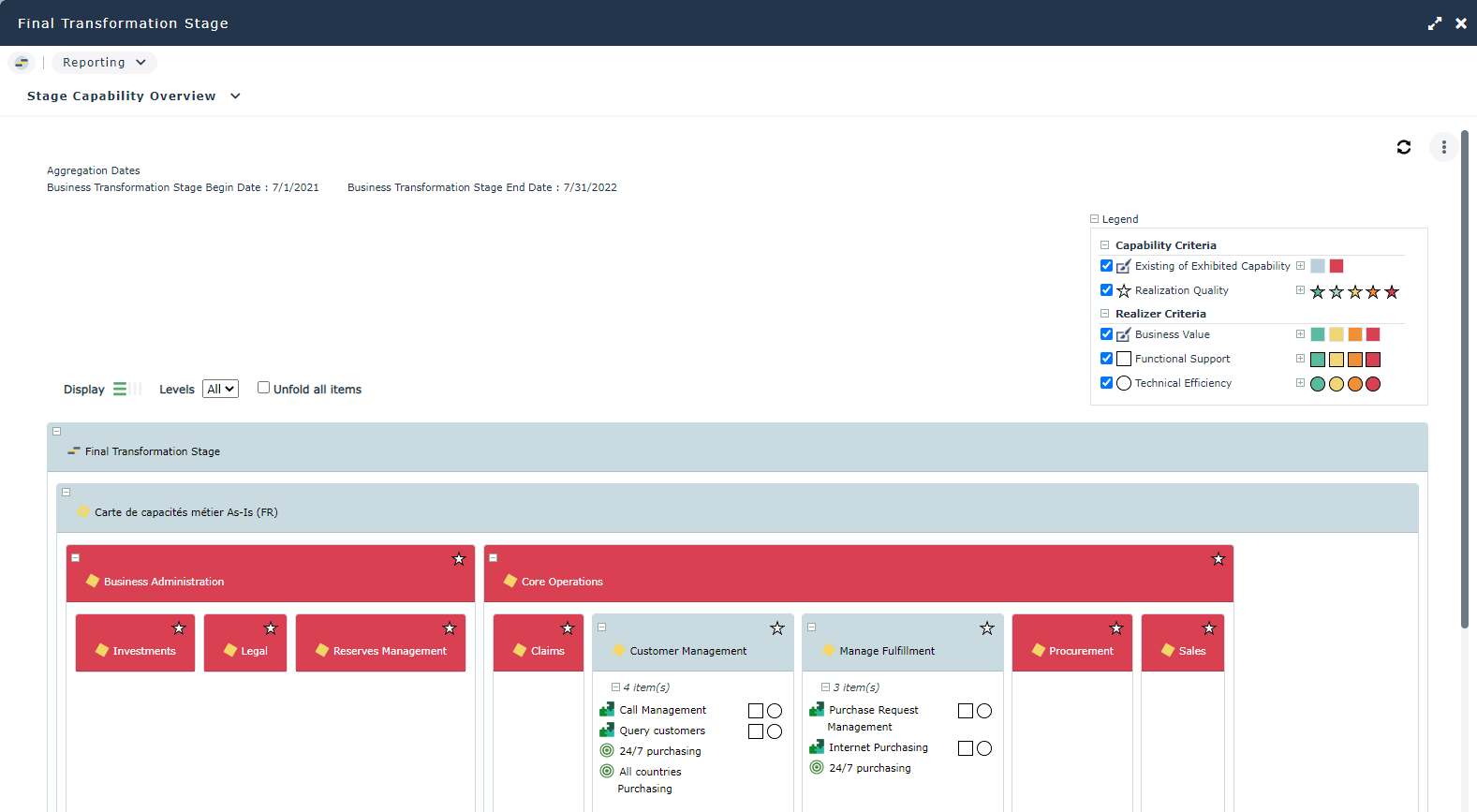 This report is available on a dedicated Report properties page of the transformation stage. It presents a view of the enterprise business capabilities highlighting the exhibited business capabilities.