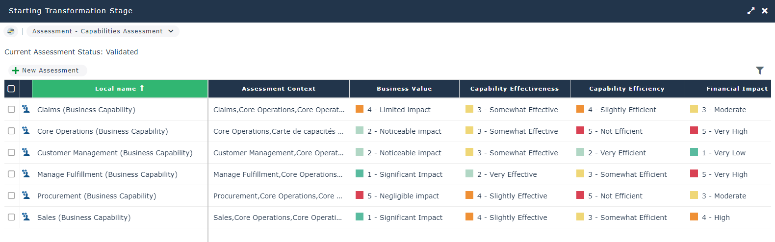 From a transformation stage, you can create a new assessment with a view to assessing some business capabilities connected to the enterprise business capability map.