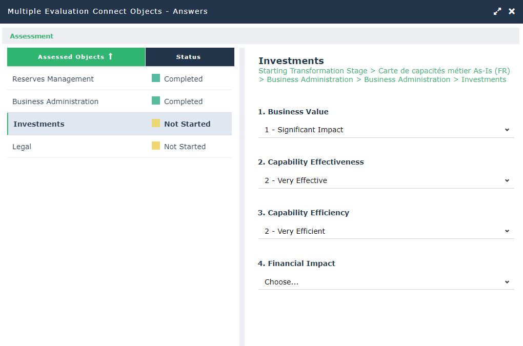 The assessment are based on a business capability map and are accessible using the enterprise stages to which the map is connected. These assessments are therefore valid in the context of a transformation stage and at a given date.
