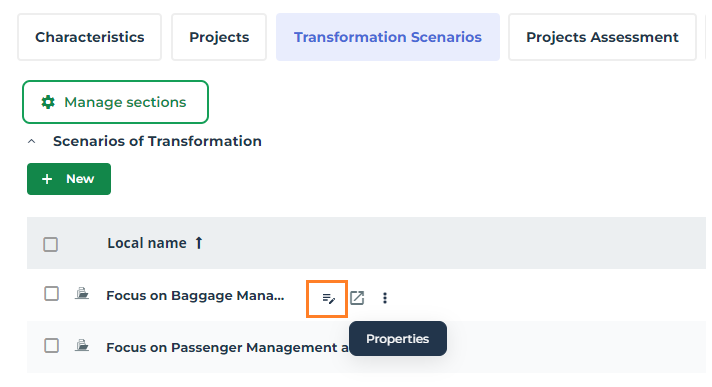 1. In the portfolio properties, in the Transformation Scenario page, move the mouse over the scenario in question and click the associated Properties button.