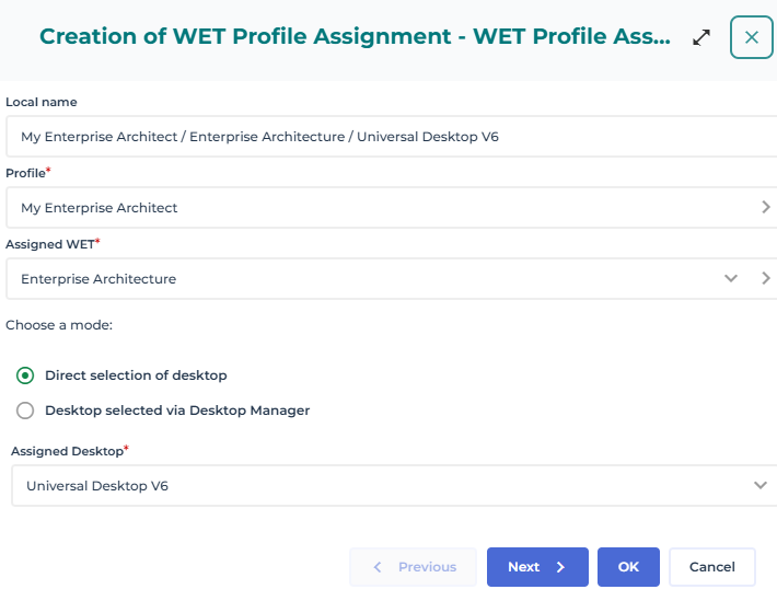 To complete the profile configuration, you must assign a WET to the profile and define the desktop associated with this WET assignment: