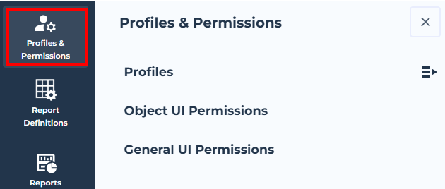 The Profiles & Permissions navigation menu enables management of UI access for the complete environment and for each Set of UI access rights: