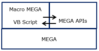 MEGA APIs are natively COM and can be used by COM application. The VB Script language uses the Dispatch protocol to handle objects and access their methods. Therefore using VB Script language to access MEGA objects is completely standard. The following diagram illustrates the way the VB Script component interacts with MEGA APIs: