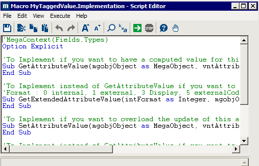 You can use the script editor to write VB scripts using MEGA APIs, which enables you to execute operations on Hopex repository content.