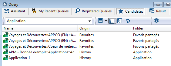 *This tab does not appear if you run the query tool from the desktop (you therefore have access to the navigator, enabling you to easily handle repository objects and in particular your favorites and history).