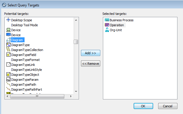 3. In the Select Query Targets dialog box, select the object types on which you want to run a search, then click Add.