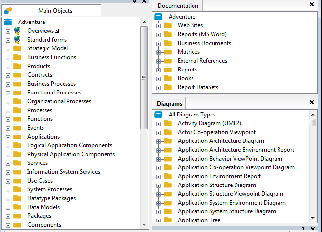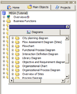 • a navigation window that contains navigators dedicated to objects, projects, diagrams, utilities, etc.