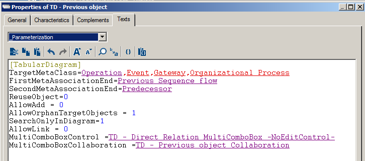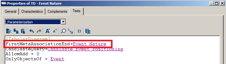 2. Open the Texts property page of the TagguedValue object, in the _Parameterizations section, use the [TabularDiagram] command to specify: