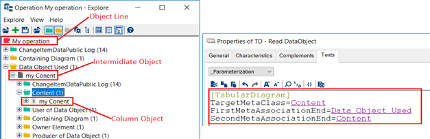 2. Open the Texts property page of the TagguedValue object and, in the _Parameterization section, use the [TabularDiagram] command to specify the link used for column calculation.