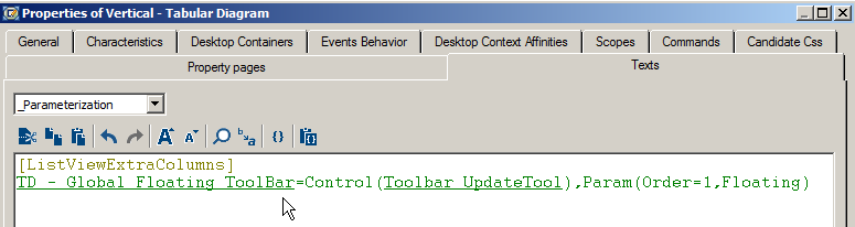 2. In Texts > _Parameterization, use the [ListviewExtraColumns] and the TD - Global Floating ToolBar generic macro to specify the command below: