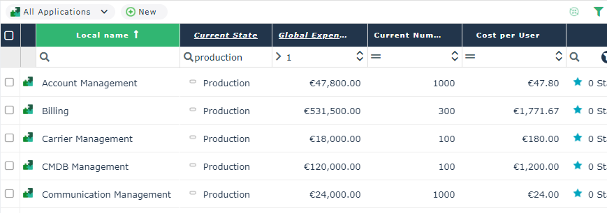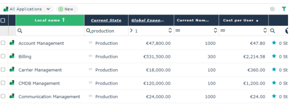 In this case the "Cost per user" values of "Billing" and "Carrier Management" Applications are not up-to-date.