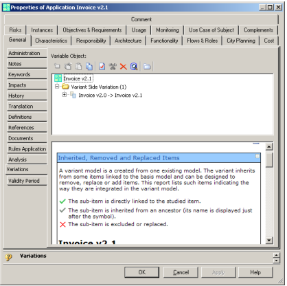 Inheriting from Variable Object will add a General/Variations tab in the property pages of the extended concept. This tab shows information related to the variation lineage.