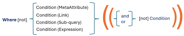 A condition indicates the query criterion or criteria. A condition is optional: if there is no condition, the result is the set or the combination of sets indicated after the From operator. If no set was specified, the result contains all objects of the type indicated.