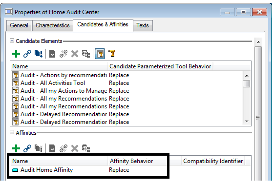 In the example above, an affinity is connected to the "Audit Home" desktop, which corresponds to the Home navigation tab of the Hopex audit solution.