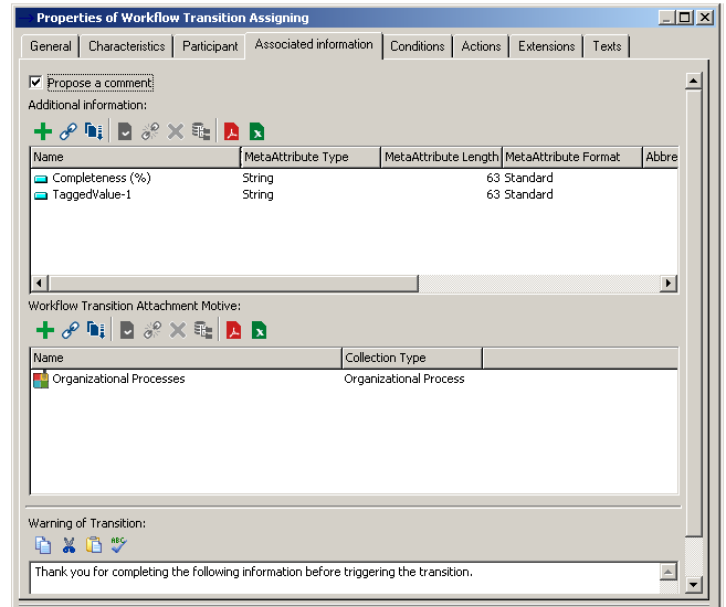 At triggering of the corresponding workflow transition, the dialog box proposed to the user will display the TaggedValues value specified here.
