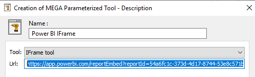 1) In the MEGA Parameterized Tool – Description creation wizard, in the Tool field, select IFrame tool.