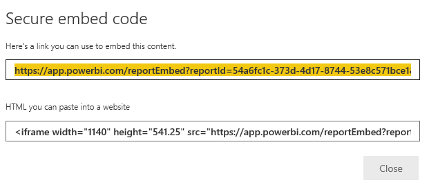 4) In the report tool bar, select File -> Embed to get a link to securely embed this report in a website or portal.