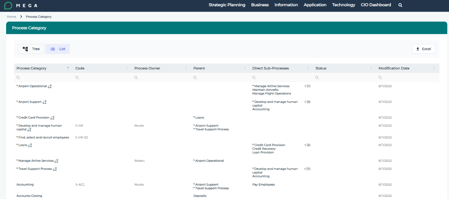 Processes Tree list: searchable hierarchical list