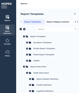 • the Public Report Data Views classified by their source Definition (Report DataSet Definition, TreeSet Definition, GraphSet Definition). These Public Report Data Views can be reused in Report Templates