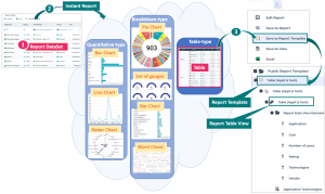 E.g.: Breakdown (pie chart, bar chart, set of gauges, word cloud), Matrix (bar chart, radar chart, Quantitative (bar chart, line chart, radar chart), Table.