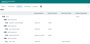 For example, the "Application Techno Vendors" Report Chapter includes four Report Data Views showing three graphics (a set of gauges and two pie charts) and a matrix one above the other (Container Organization of the group: "Vertical")