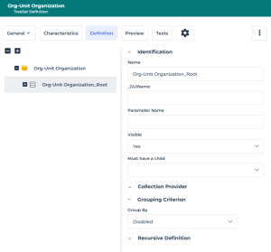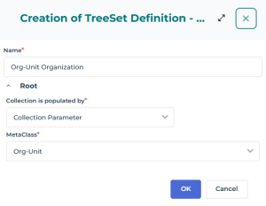 - MetaCollectionParameter Populating collection: "Org-Unit Organisation_root", i.e. this Collection parameter populates the root node of the "Org-Unit Organization" TreeSet Definition.