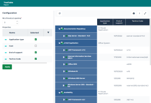 It also displays Properties: "Application Type" and "Cost" values of each application, and "Techno Code" and "End of support" date of each technology.