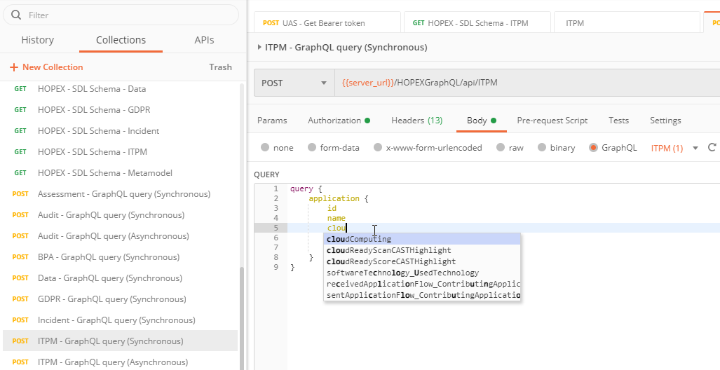 • Call of of the endpoint of the required schema {{server_url}}/HOPEXGraphQL/api/ITPM/sdl. The response will be a filenamed "schema".graphql.