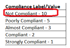 In the example below, final compliance level = (10+10+10+5+5)/5 = 8