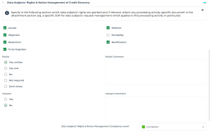 Data Subjects' rights and notice management Compliance level drop-down menu.
