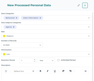 The Privacy team can later give a compliance score for the Personal Data Risk section based on the information completed by the processing activity owner: