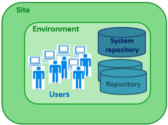 An environment groups a set of users, the repositories on which they can work, and the system repository. It is where user private workspaces, users, system data, etc. are managed.