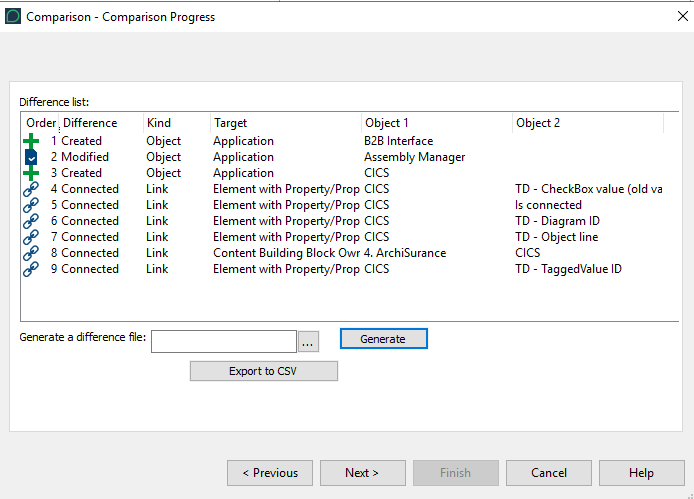 The Comparison Progress window opens. It presents the differences between compared objects and their modifications.