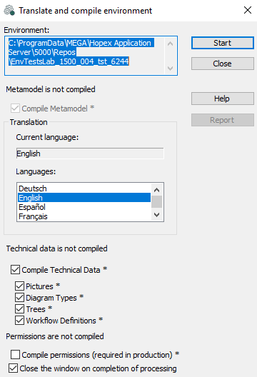 In the Hopex Administration navigation tree, an asterisk after the environment name indicates that the metamodel or/and technical data (excluding permissions) of this environment is/are in "interpreted" (not compiled) mode.