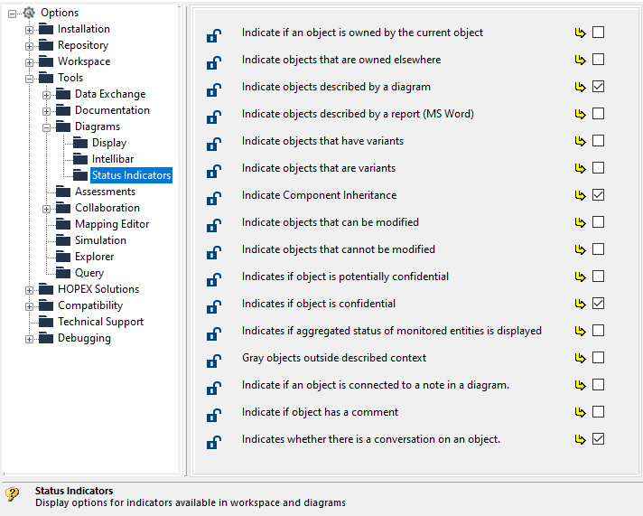 3. In the Environment Options dialog box, select Tools > Diagrams > Status Indicators.