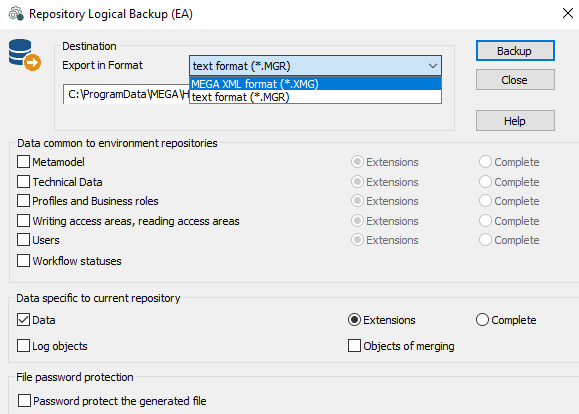 You can choose what you want to save: extensions common to environment repositories and data specific to current repository. It is recommended that you save all these elements in separate specific files, with names indicating their contents.