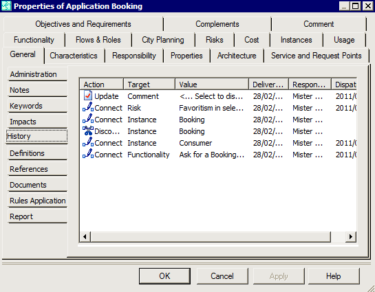 In the properties dialog box of an object, the History subtab of the General tab gives an overview of actions on each object in the repository. At each update concerning the object (Create, Modify, Connect, Disconnect), the corresponding action is added to the list.
