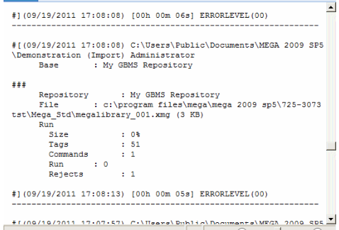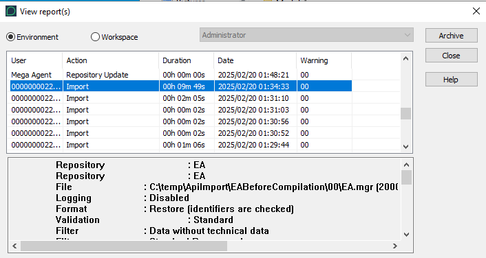 • Action executed: dispatch, import, installation, translation, export, derivation, extraction, backup, update, user diagram extraction, user diagram import, repository translation, repository or environment check, repository creation, repository deletion, log initialization, object protection, etc.