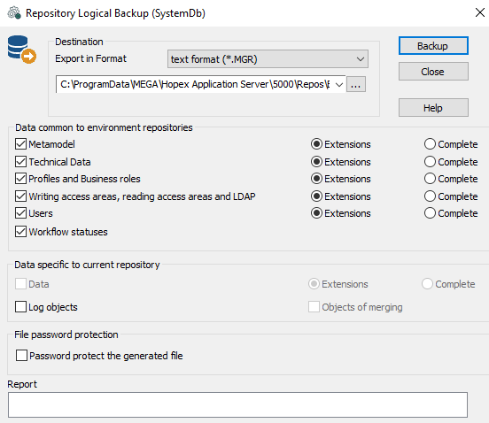 In the Data common to environment repositories pane, select the data type of the system repository to be saved: