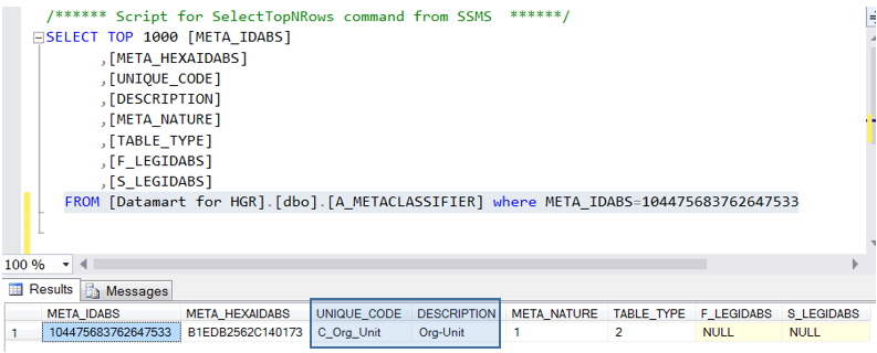 1) In your Reporting Datamart tree view, right-click dbo.A_METACLASSIFIER and select Select Top 1000 rows.