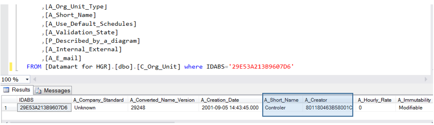 The query result details all the Org-Unit attributes (IdAbs: 29E53A213B9607D6, Short Name: Controler). It indicates, in particular that its creator IdAbs is: 801180463B58001C.