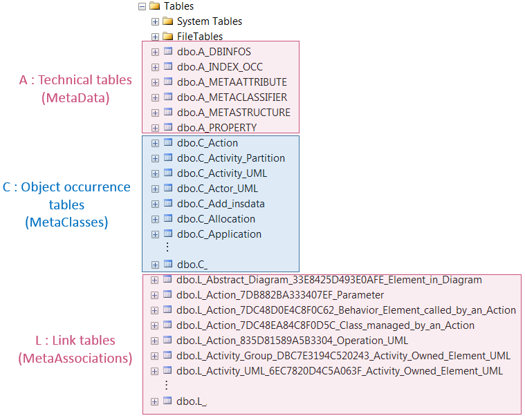In dbo.C_<MetaClass name>, the Columns folder details the attributes or tagged values belonging to the MetaClass occurrence concerned. Each column name is prefixed as follows: