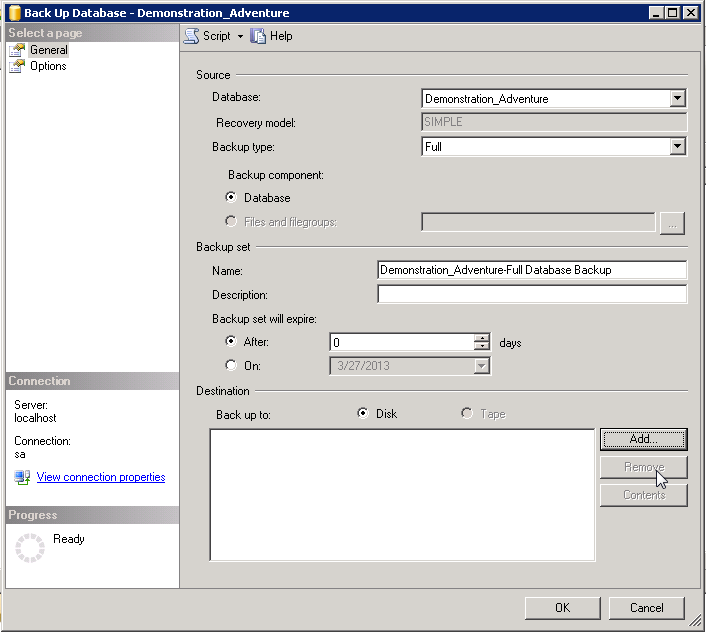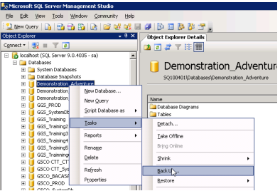 3. To make a backup of the source database (for example, Demonstration_Adventure), right-click the database and select Tasks > Back Up.