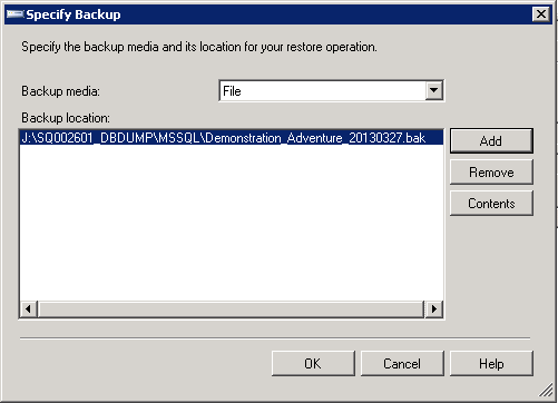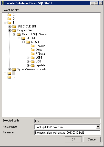 Otherwise, browse the folders to get to it. Then, click the .bak file that you just copied on the server (for example: « Demonstration_Adventure_20130327.bak »).