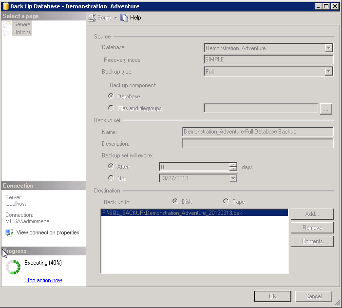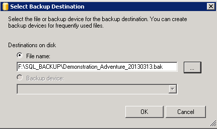 6. Choose a location where you know that the user you authenticated with, has rights to write on. In this example in « F:\SQL_BACKUP » of the F drive, and give the name of the backup file to create (here Demonstration_Adventure_20130313.bak).