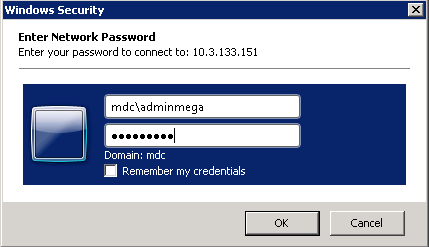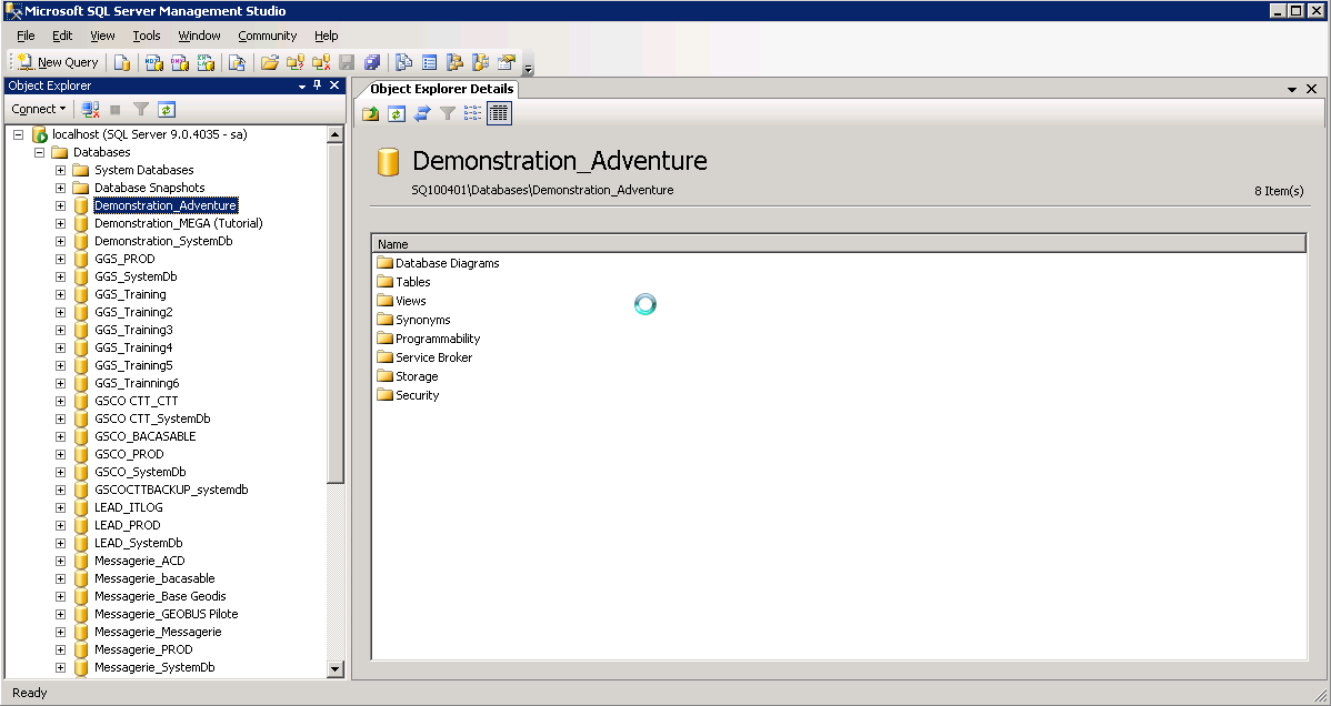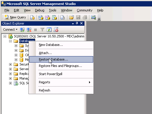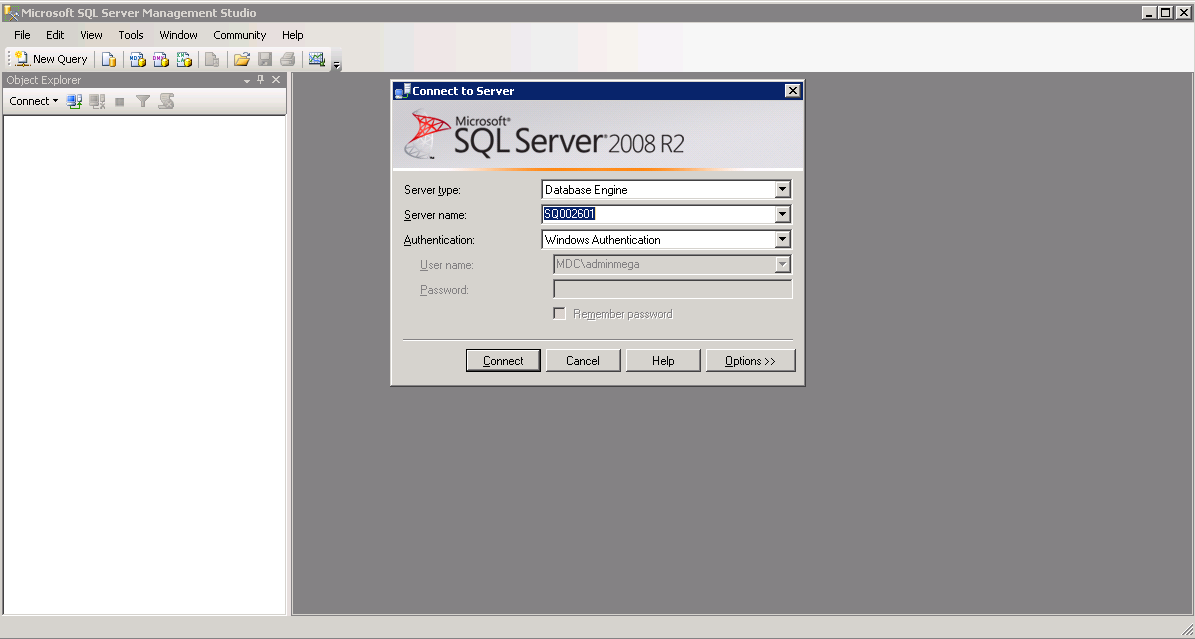 2. Launch the Management Studio, and connect to the instance using, if possible, a Windows account that is both sysadmin, and has access rights to the folder where the backup file was copied (example: mdc\adminmega).