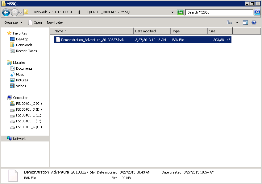 11. Transfer the backup file created on the SQL Server server, to the target server (for example, here it is SQL002601).